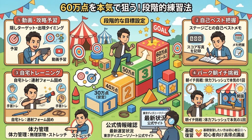 最後に、60万点を本気で狙っていくための練習の考え方も整理しておきます。一気にトップスコアを目指すというより、段階を踏んで「スコアの土台」を上げていくイメージです。トイマニは運だけで跳ねるゲームではないので、コツコツ積み上げた分だけちゃんと数字に反映されてくれるのがいいところです。