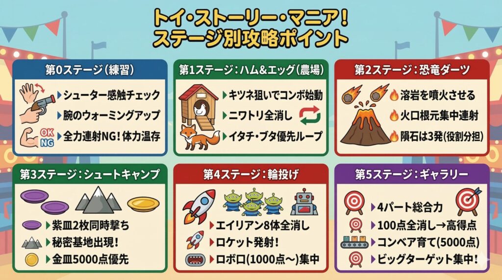ここまで、トイストーリーマニア攻略で高得点を狙うための考え方から、ステージ別の具体的な立ち回り、連射フォーム、ペアプレイの工夫、そして60万点を目指すための練習法までまとめてきました。情報量はかなり多かったと思うので、「全部一気には無理…」という場合は、まず気になったステージから1つずつ試してみてください。