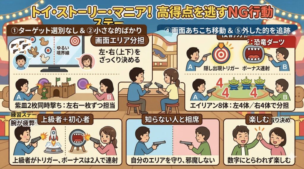 上級者+初心者の組み合わせなら、上級者側が隠し要素の発動を優先して狙い、ボーナスタイムに入ったら2人で一緒に連射していくスタイルがおすすめです。例えば、バズのステージでロケットを飛ばすまでは上級者がエイリアンを全部担当し、ロボットが出てきたら2人とも口に向かって全力連射する…といったイメージです。これなら初心者側も「やることが分かりやすくて楽しい」ですし、結果として2人ともスコアを伸ばしやすくなります。