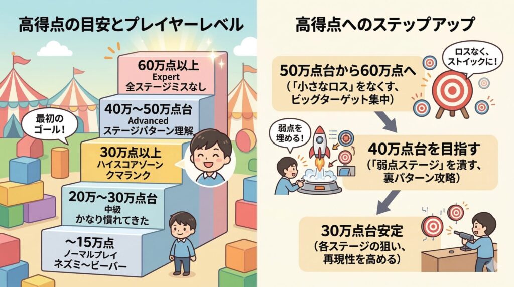 60万点は完全に上級者帯で、全ステージでほぼミスなく隠しターゲットを出し続ける必要があります。いきなりそこを狙うというより、「まずは30万→40万→50万」というステップアップを意識していくと、上達の実感も持ちやすいですし、プレイごとに小さな成長を感じやすいです。「昨日より1万点伸びた!」みたいな手応えがあると、それだけでまた乗りたくなります。
