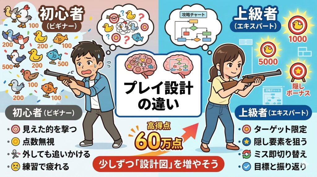 同じアトラクションなのに、初心者が10万点前後で終わる一方、上級者は60万点に迫るスコアを叩き出すことがあります。この差は「反射神経の違い」だけではなく、プレイ設計の違いが大きいです。つまり、ゲームが始まる前から、頭の中にある「攻略チャート」がまったく違うイメージです。
