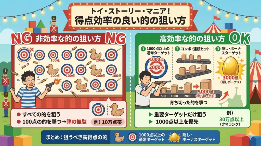 100点の的をいくら当てても、1000点・2000点・隠しターゲットを外しているとスコアは伸びません。高得点の人ほど、撃つ的を最初から絞っています。