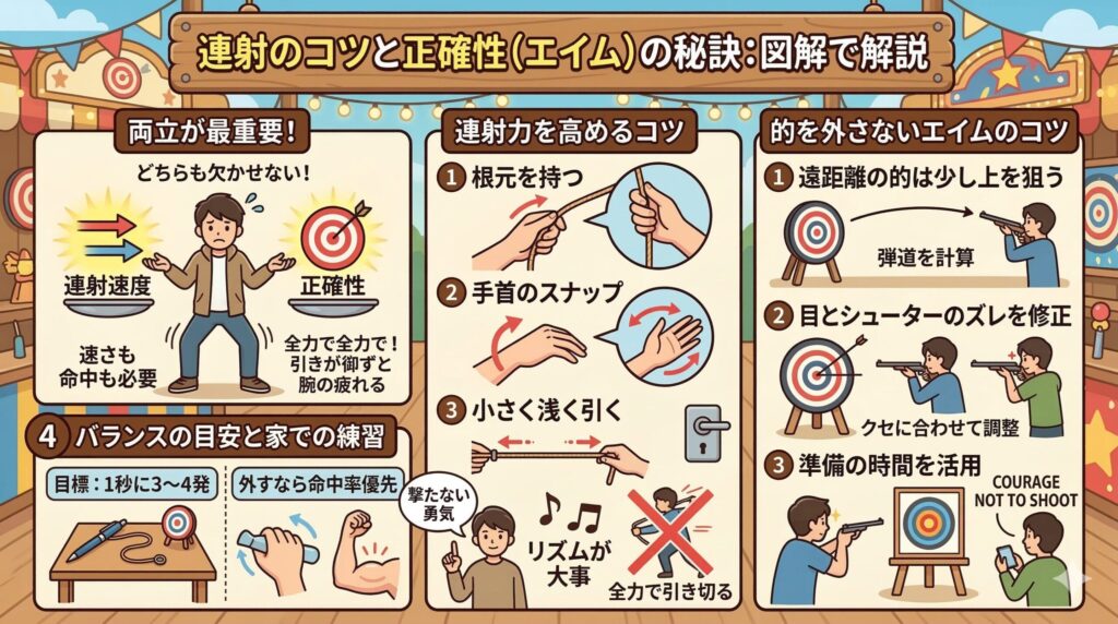 連射と正確性は、一度で完璧になるものではありません。ただ、毎回のプレイで「今日はフォームを意識してみる」「今日は遠い的を狙うときの照準だけ気にしてみる」など、テーマを1つ決めて乗ると、上達スピードがぐっと上がりますよ。