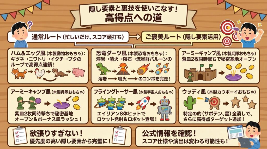 優先度の高い隠し要素を1ステージずつ覚えるだけでも、スコアは確実に伸びます。