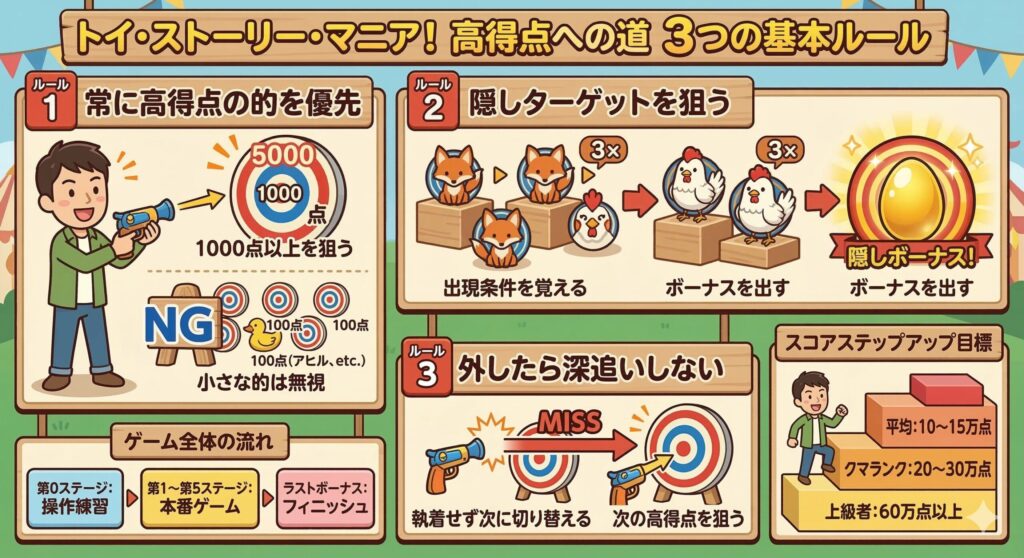 まずはトイストーリーマニアで高得点を取るための前提から整理していきます。