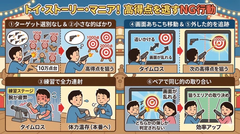 この記事では、トイストーリーマニア攻略方法を知り高得点を目指すあなたに向けて、ステージごとの具体的なパターン、連射テクニック、ペアプレイでの立ち回りまで、私自身がやり込んできた経験をベースに分かりやすく整理してお伝えします。