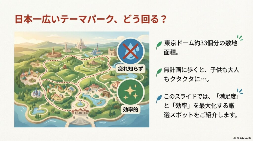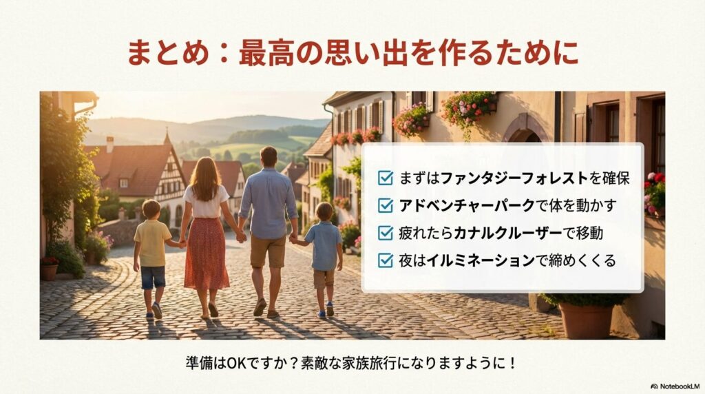 例えば、未就学児がいるなら“待ち時間が長い絶叫”より、短時間で達成感がある体験型や、雨でも崩れない屋内施設を先に入れる。