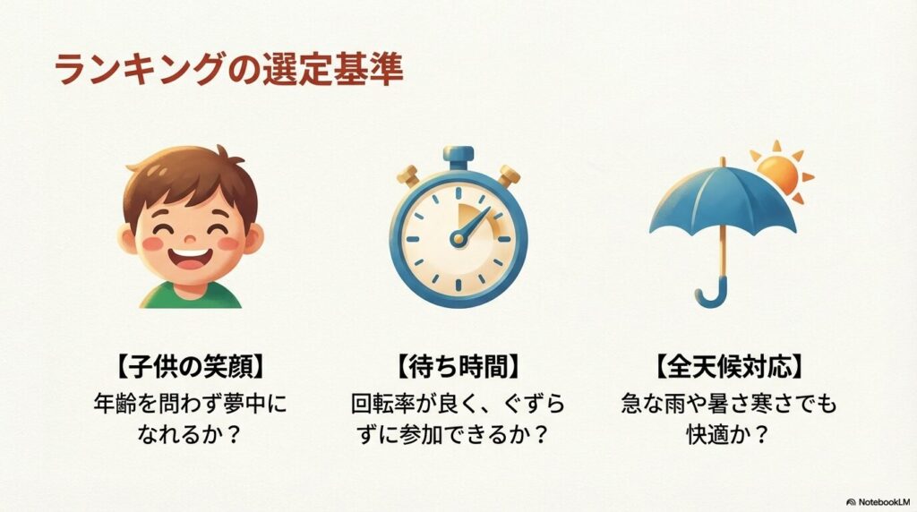 だからこそ私が子連れで回るときは、最初に「人気×年齢適性×天候耐性」の3点で候補を絞ります。ランキング上位は満足度が高い一方で、どうしても混雑しやすい。