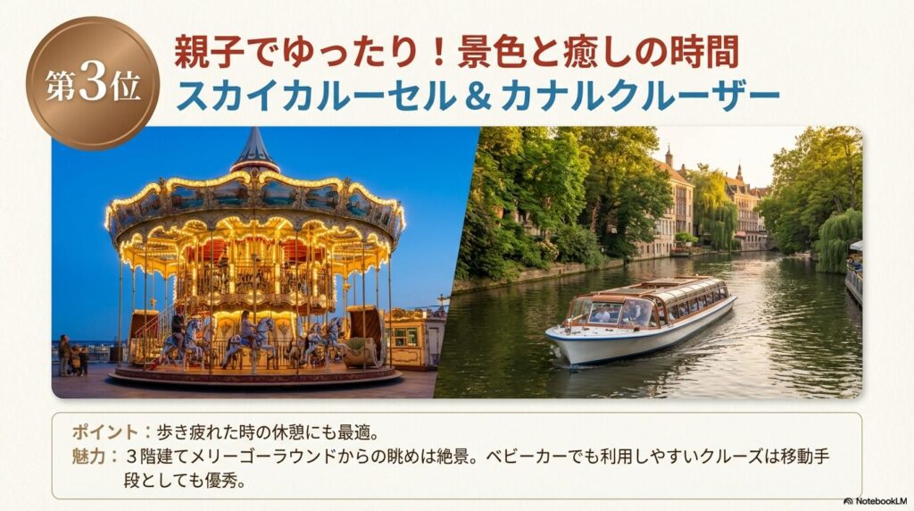 歩き疲れても「ちょっと寄ろう」ができるし、撮影が共同作業になるので家族の会話が増えます。観覧車は、移動で疲れた体を休めつつ、景色を楽しめる万能枠。子どもが眠そうなとき、テンションが落ちてきたときの“回復アトラクション”としても使えます。