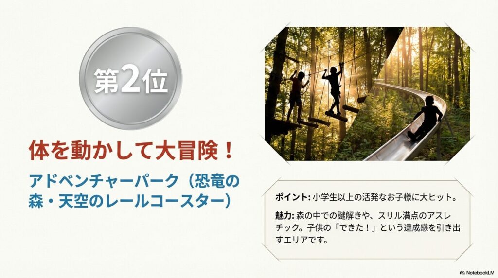 屋内アスレチック(ファンタジーフォレスト)や4D・シアター(ミッション・ディープシー、ホライゾン)を軸に組むと崩れません。