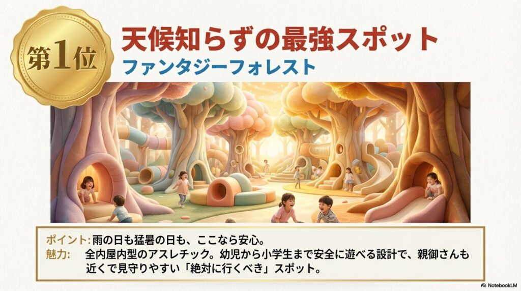 | 2 | ファンタジーフォレスト | 屋内アスレチック | 0歳〜未就学児中心 | 強い | 雨の日は混みやすい | 30〜60分 | 子どもが全力で遊べて機嫌が復活 |
