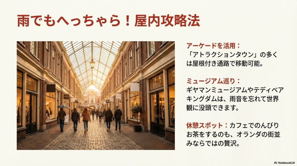 - 雨の日は屋内施設を軸にして崩れないプランへ