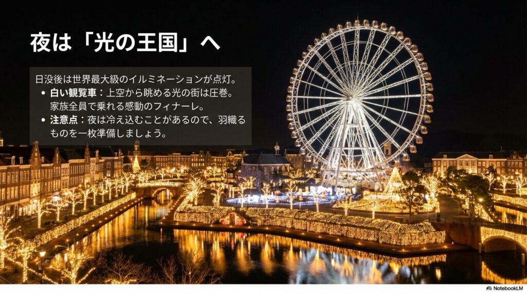 昼は街並みをゆっくり眺めて、家族でほっと一息。夜はイルミネーションが入るとロマンチック度が上がって、写真の仕上がりも変わります。混雑具合は日によるので、アプリや現地の状況を見て判断してください。