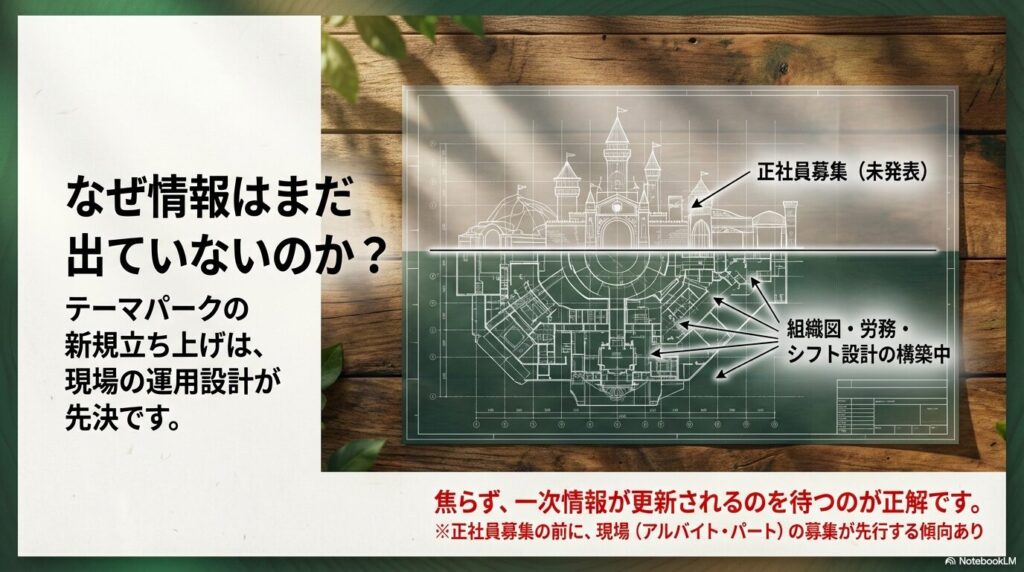 ここで大事なのは、「情報がない=裏で何も動いていない」ではないってこと。テーマパークの新規立ち上げって、現場が回る設計が固まってから、雇用形態ごとに順番に出していくことが多いんですよ。