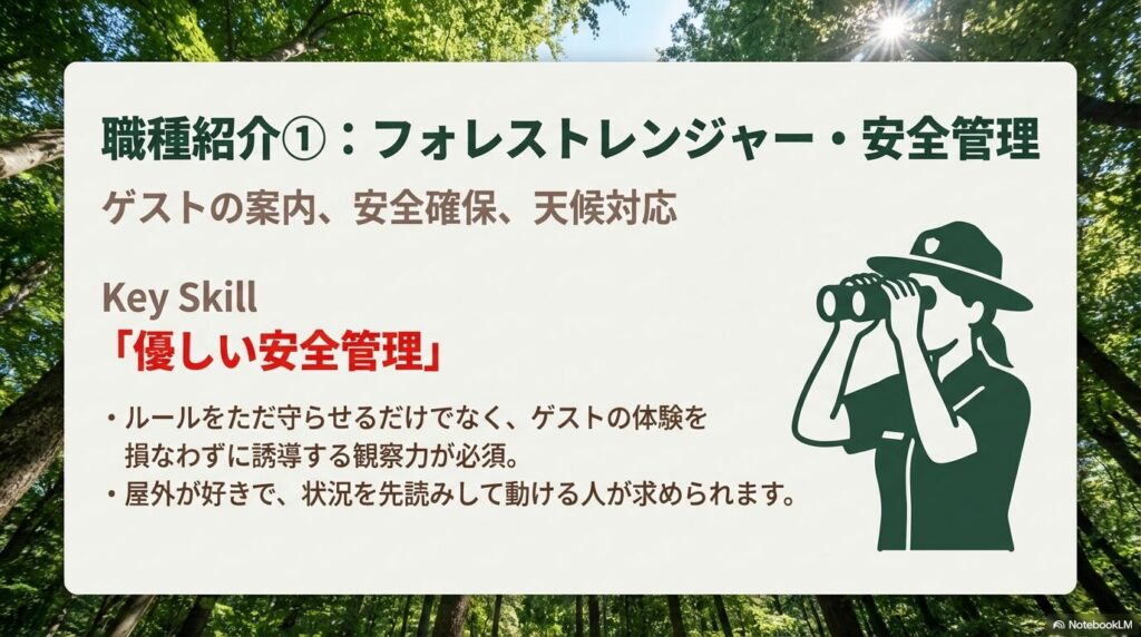 イメージとしては、ポケモンフォレストでの運営サポートや、安全管理、来園者の案内などを担うポジション。屋外施設だからこそ、気温・雨・風・足元など、ゲストの体験に影響する変数が多いはずで、現場の観察力がモノを言う仕事だと思います。