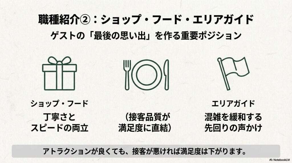エリアガイドとエンタメオペレーターは「体験の品質」を左右するポジションです。正社員を狙う人も、ここで求められるスキルは転用しやすいですよ。