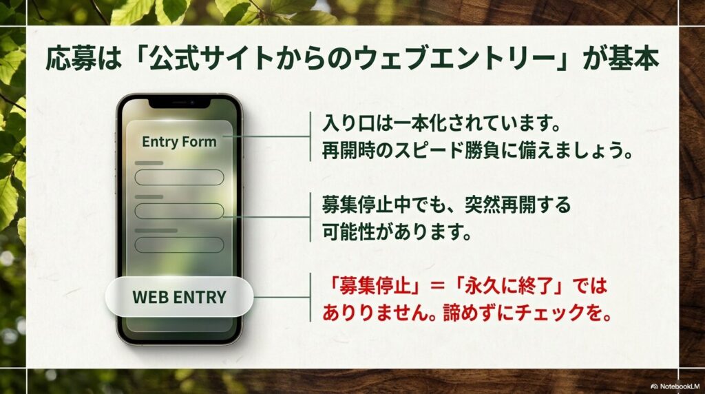 ここ、地味に重要ポイントで、入口が一本化されていると「募集が始まった瞬間に応募が集中しやすい」んですよ。