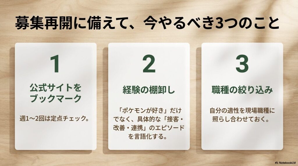 次に、あなたの経験を現場の言葉に変換しておくこと。接客、語学、教育、改善、どれでもOK。最後に、条件面は必ず公式で確認して、自己判断で突っ走らないこと。これが一番大事です。