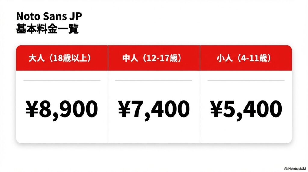 ざっくりした大人料金の目安としては、エリートトレーナーズパスが14,000円前後から、トレーナーズパスが7,900円前後から、タウンパスが4,700円前後からスタートするイメージですね(いずれも日付によって変動する一般的な目安です)。
