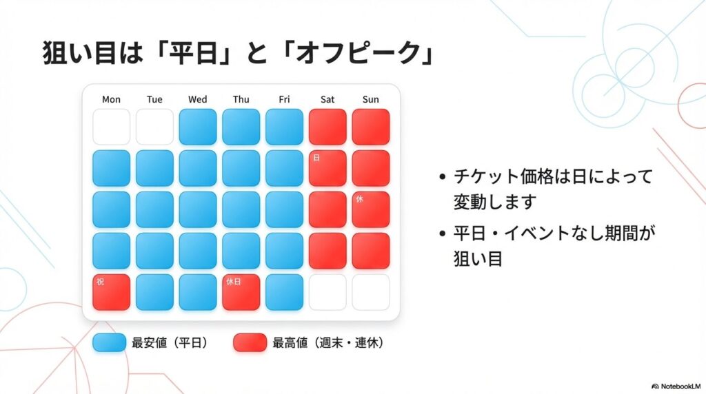 - ピークシーズンを避けて平日を狙うと、チケット代自体を下げやすい