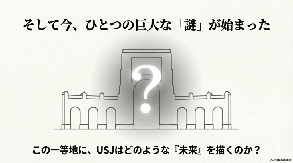 ここで大事なのは、パーク内で目立った工事が見えないからといって、跡地に何の計画もないとは全く言えないということです。むしろ、USJレベルのテーマパークで、あれだけ大きな跡地をずっと遊ばせておくことのほうが不自然です。