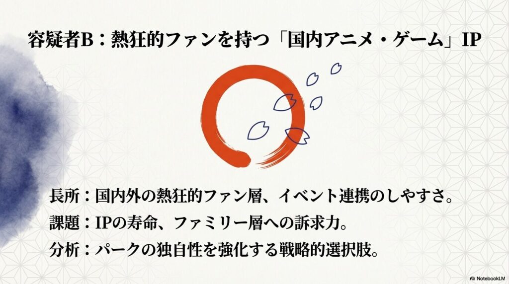 - 有力候補としては、トランスフォーマー系3Dライド、ポケモン(名探偵ピカチュウ系)を含むミニエリア構成、ワイルド・スピードなど映画IPが挙げられるが、いずれも現時点では噂・予想の域を出ない