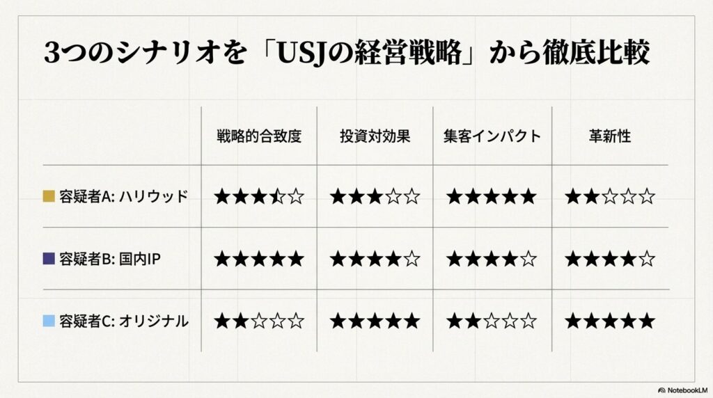 スパイダーマン跡地についても、海外ユニバの事例とUSJのこれまでの動きを足し合わせると、「既存の箱とシステムを活かせるIPが選ばれやすい」という傾向が見えてきます。