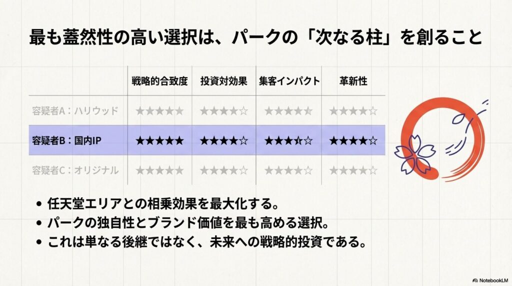 | ポケモン(名探偵ピカチュウ系) | ライド+ミニエリア | かなり高い | 任天堂との長期提携/ポケモンエリア構想との親和性 |