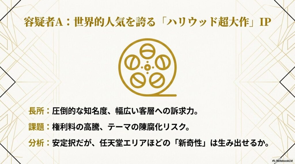 ただし、ニューヨークエリアの雰囲気や、他の候補IPとの優先度を考えると、「十分ありえるけれど最有力とまでは言い切れない」というのが正直なところです。どちらかと言えば、既存の映画IPで隙間を埋める「2番手〜3番手候補」といったポジションに近いかなと思います。