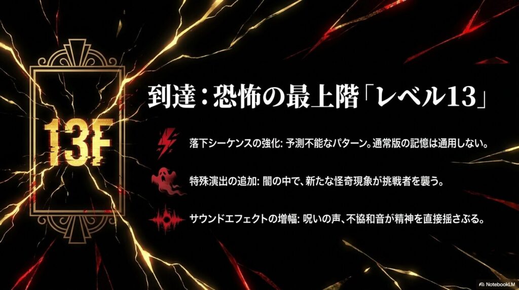 - レベル13:通常版より1〜2段階上の怖さ。ホラー度と落下の不規則さが強め
