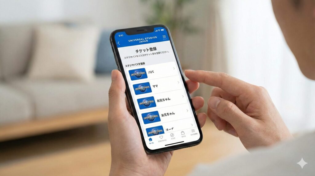 代表者の方が全員分のスタジオ・パスを自分のアプリに登録しておけば、一括で整理券を取得できます。入場時も代表者のスマホ画面を人数分スキャンするだけでOKなので、全員がスマホを持っている必要はありません。